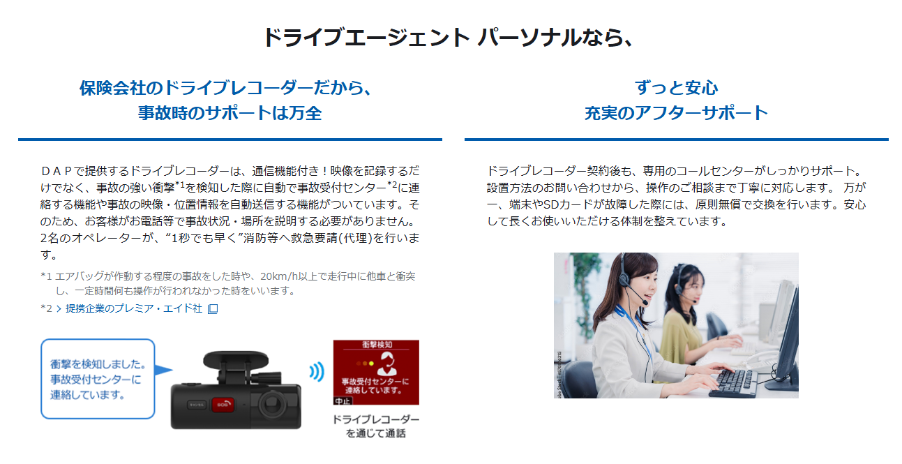 ・強い衝撃をドライブレコーダーが検知し、自動で事故受付センターに連絡!