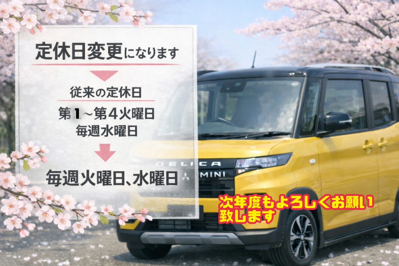 次年度4月より 毎週火曜日・水曜日が定休日となります